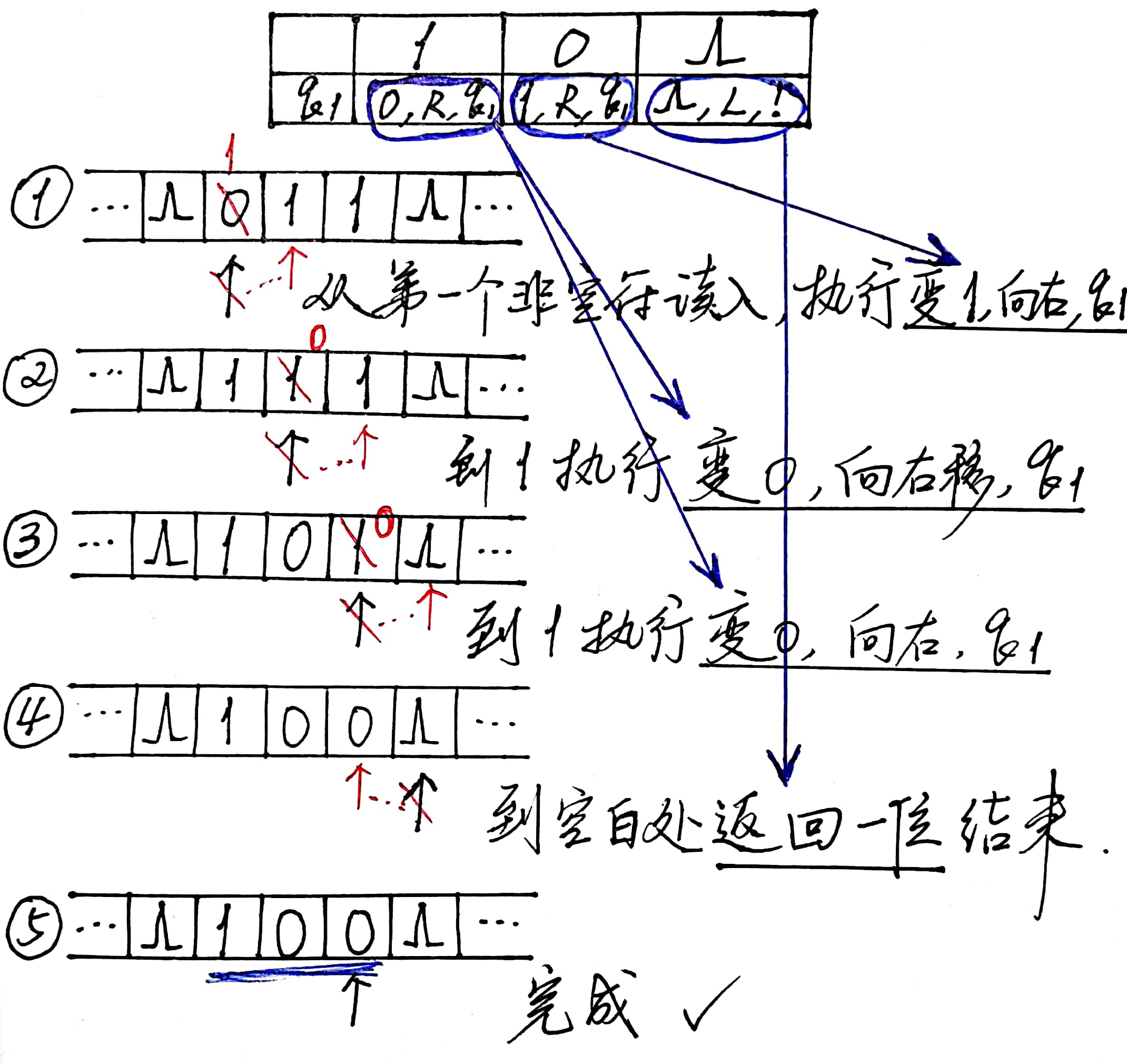 先移动到最后一位,遇到空白再返回一位。若最后一位为0则改1。若为1改为0再到前置位循环判断。